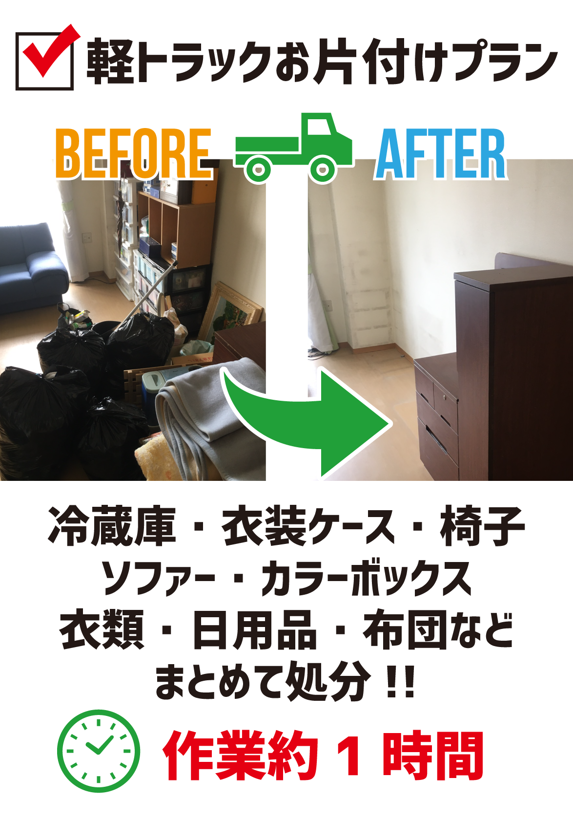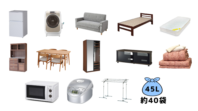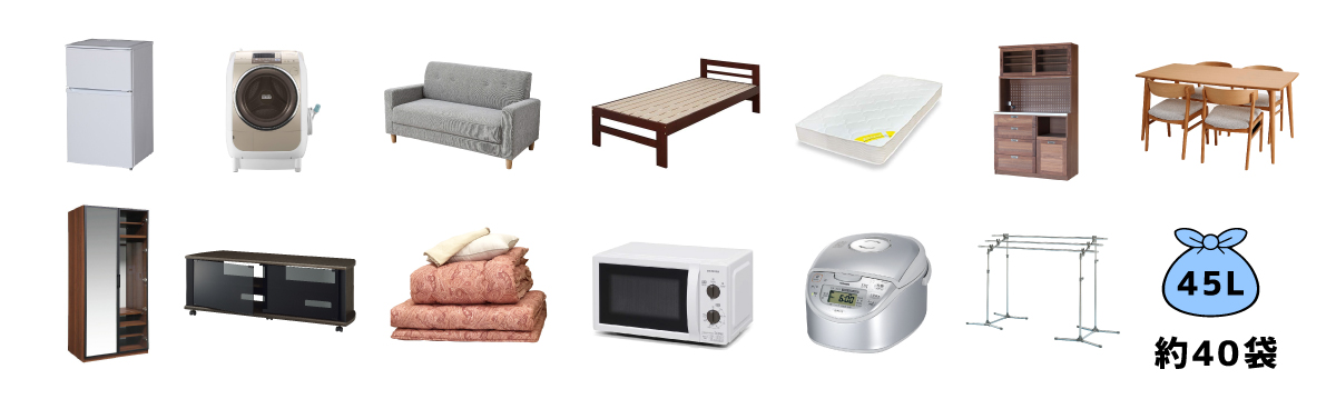 冷蔵庫、洗濯機、3人掛けソファー、ベッド、マットレス、キッチンボード、ダイニングテーブル、ワードローブ(タンス大)、テレビ台、布団一式、電子レンジ、炊飯器、物干し台、ゴミ袋40袋ほどの不用品の積み込みが可能です!![]() ![]() |
