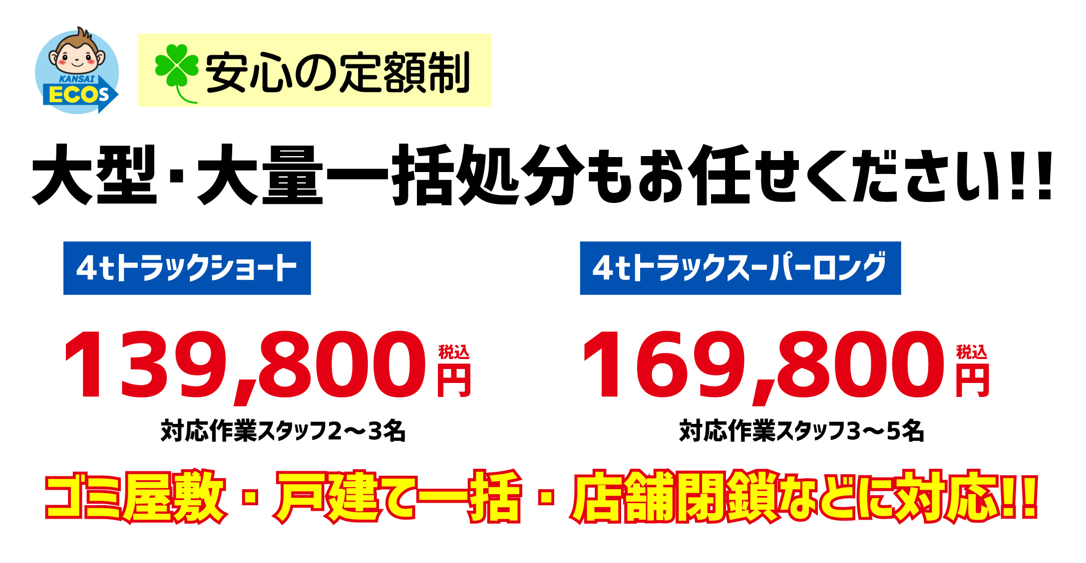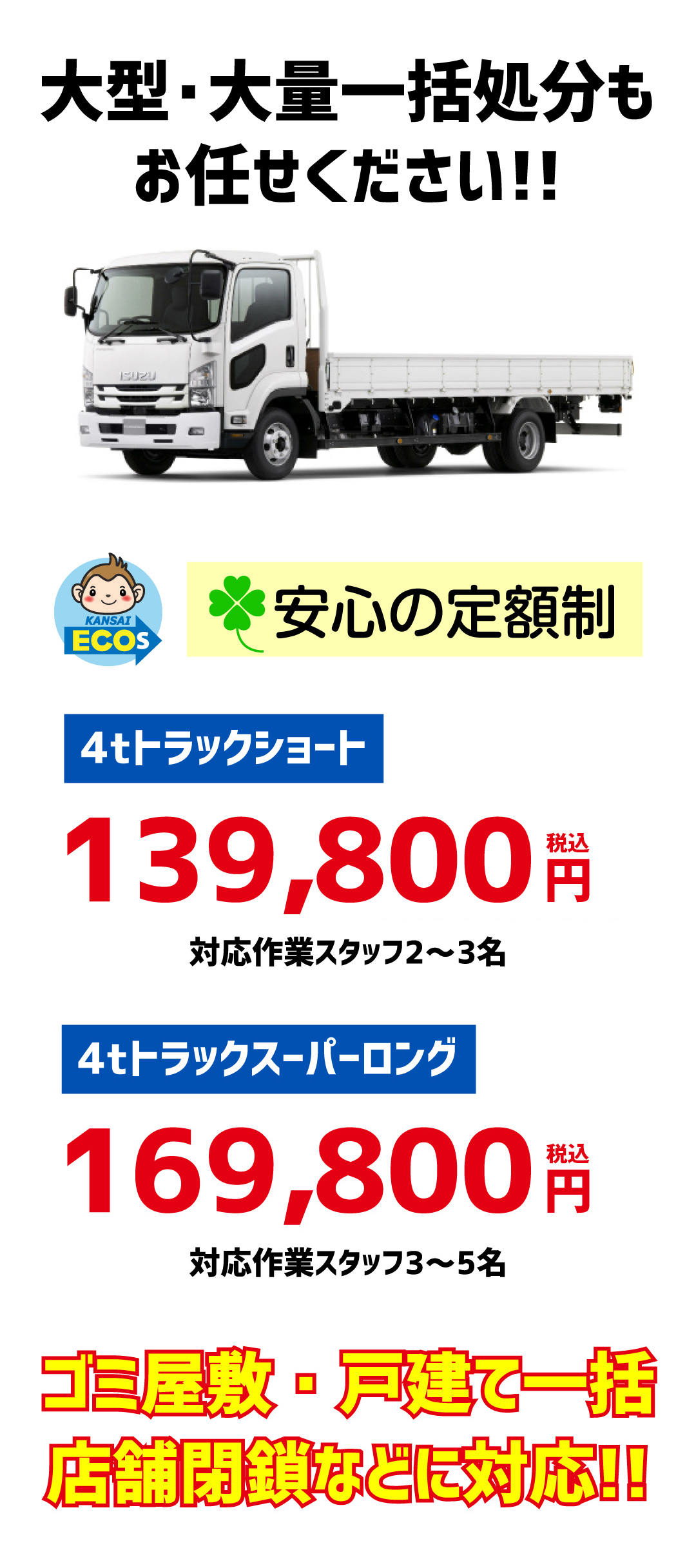 ゴミ屋敷の一括処分、取り壊しの一軒家、店舗閉鎖により一括処分など大量かつ大型の不用品が数多くある場合にも関西エコーズは対応可能です。4tトラックショート(長さ約620㎝×横幅約210㎝、高さ約1m)、4tトラックスーパーロング(長さ約820㎝×横幅約210㎝、高さ約1m)で積載量に合わせた車種をご用意いたします。業者さまもお気軽にご利用くださいませ。